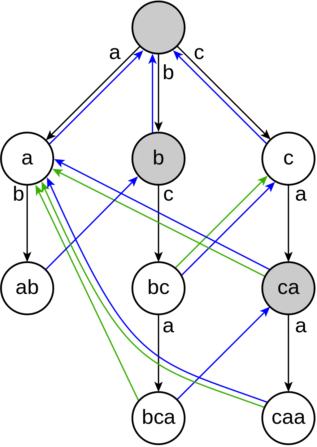 Look at the graph representation of a prefix function from the “Introduction to algorithms” book by Cormen (CLRS).